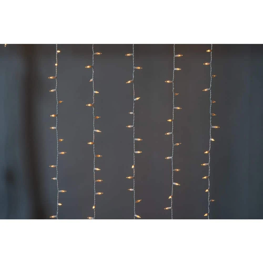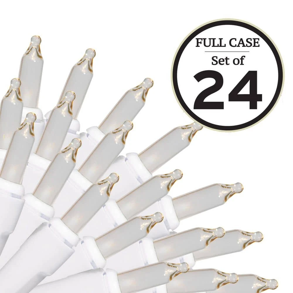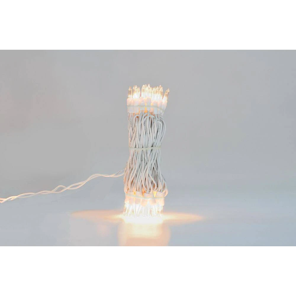 100-Light String to string light set, clear, white wire. 18 in. x 2.5 in. SP x 3.5 in., total length approximately 22.42 ft., maximum connect: 4 sets. Set wattage: 42.5-Watt, UL Listed, indoor/outdoor. Replacement bulb: 2-piece, clear, (2.5-Volt/170 MA), replacement fuse: 1-piece.