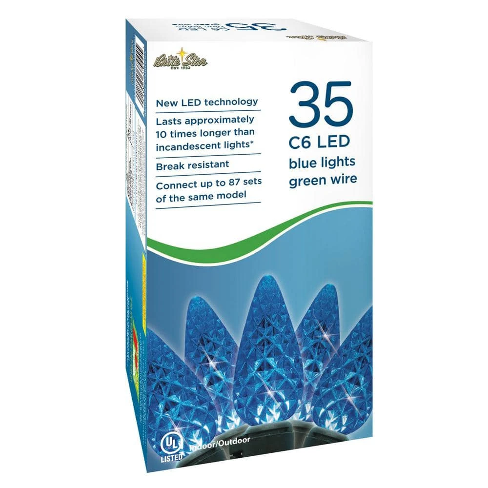 Blue C6 LED bulbs bring a classic, old-fashioned ambiance to your holiday decor. LED lights save energy are cool to the touch, making them safe around children and pets. Each strand has 35 bulbs and measures 12 ft., including a 4 in. lead cord, 4 in. spacing between bulbs and 4 in. end cord. Includes spare bulbs and fuses. Strung on green wire to blend in with Christmas tree and exterior landscaping. Set of two, 35-light strings for 70 total bulbs. Suitable for indoor and outdoor use. UL-listed. Box of 2.