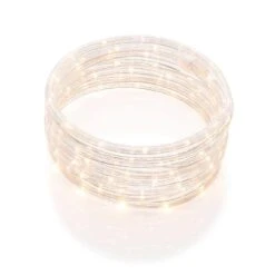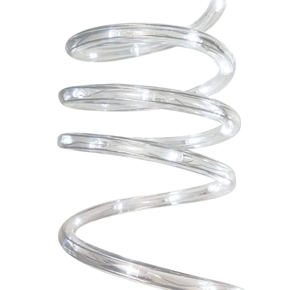 This 12 ft. Pure White Led Round Rope Light has 15 in. White Wire Lead x 2 in. Sp, can Connect 20 Sets Together. 1 ft. Power Cord with Extendable Ring Type End Connector, 9 Clips/Screws, Horizontal Inserted Bulbs. It can use Indoor/Outdoor with 1-piece Replacement Fuse.