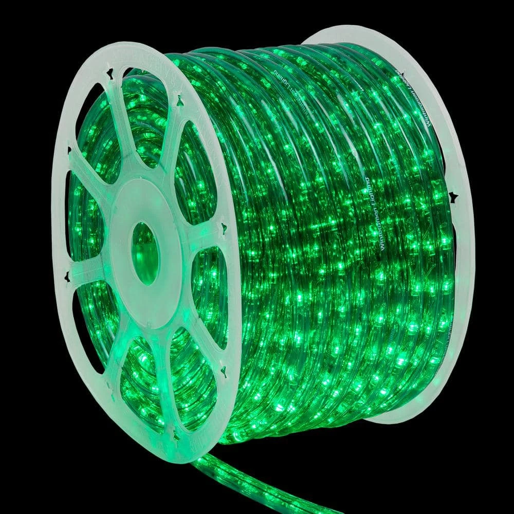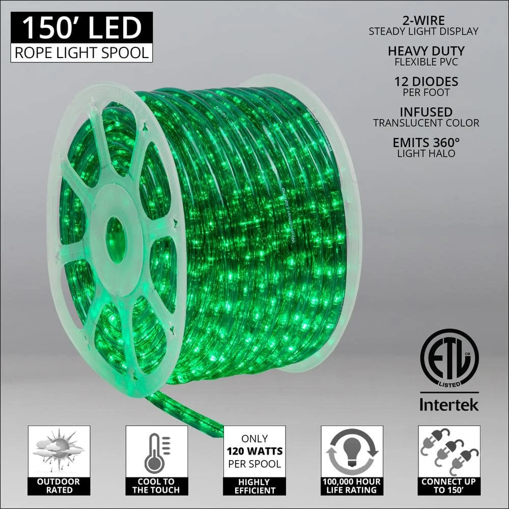 - 150 ft. spool of green LED rope light, plus 4 power cords, 3 splice connectors, 3 end caps, sealant and mounting clips: enough accessories for 4 complete light runs