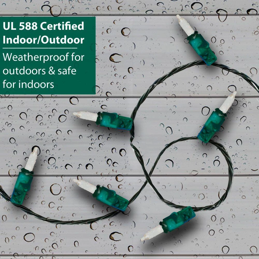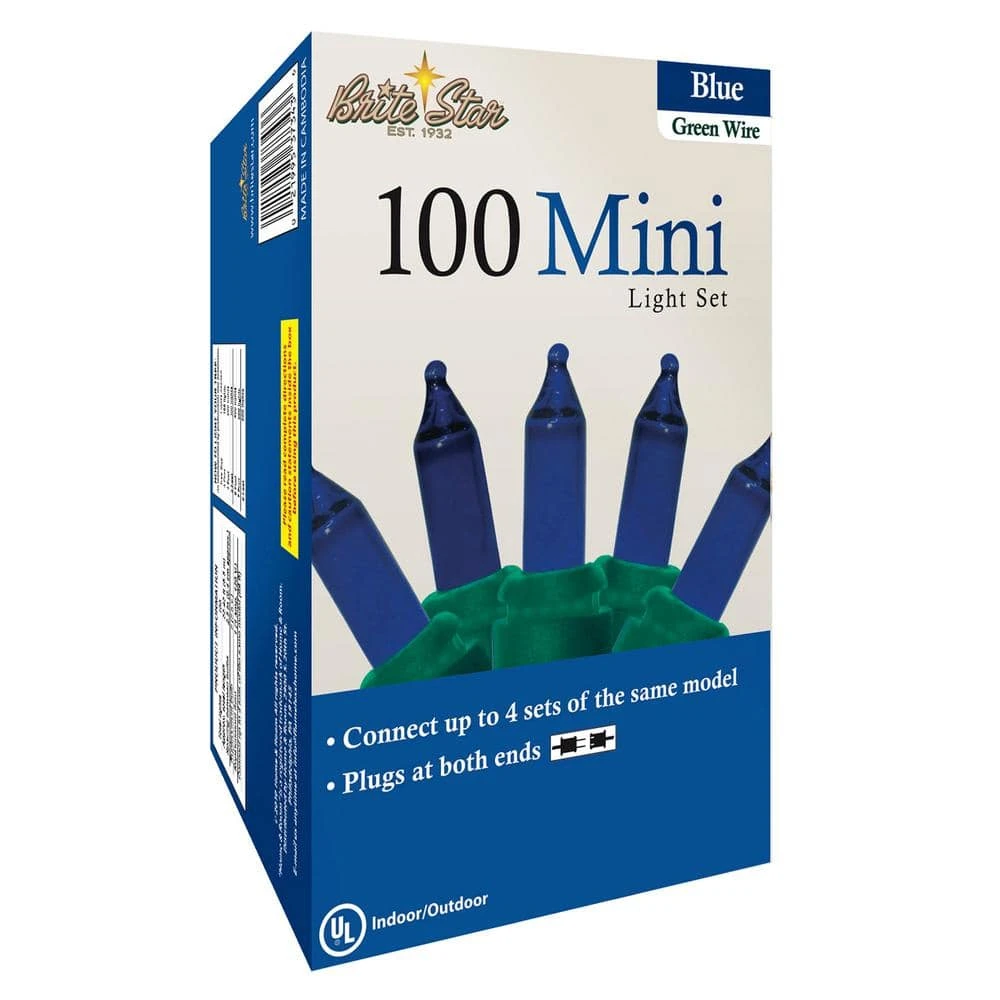Add a festive glow to your home with these Blue Mini Lights. Connect up to 4 sets (sold separately) for an extra-brilliant presentation. Each 22.4 ft. long strand has 100 incandescent lights for total 200-count lights per box. Replacement bulbs and fuses included. Suitable for indoor and outdoor use, UL-listed, box of 2.