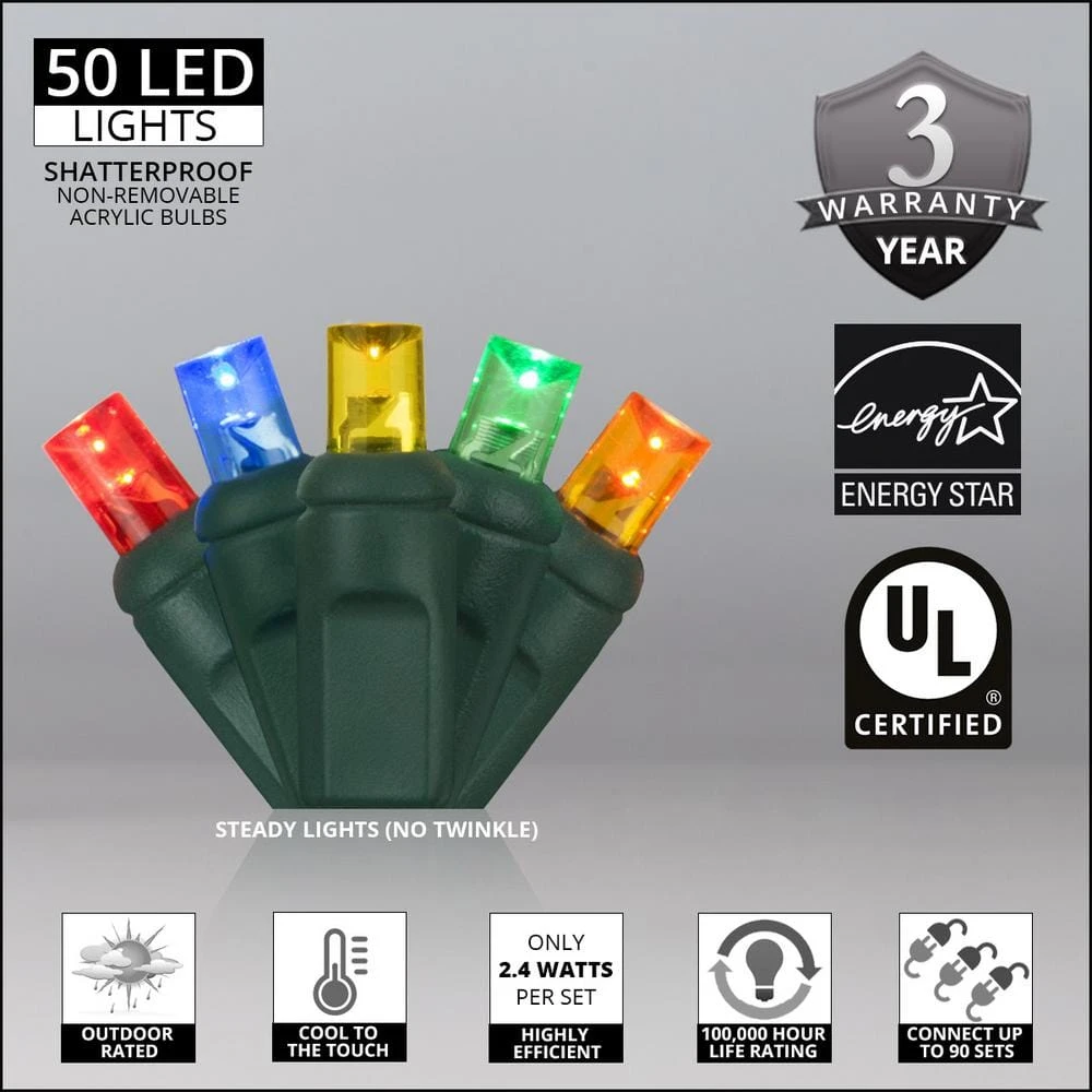 - Fifty 5 mm W angle LED mini lights spaced 6 in. apart on green wire, 6 in. lead with fused stackable male plug, 6 in. tail with female plug for end to end connections, 25.5 ft. total length