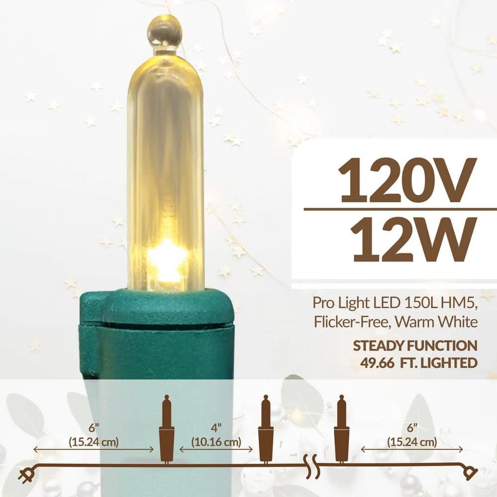 - Specifications: 150 ct LED white Christmas lights, 6 in. lead in wire, 4 in. spacing between bulbs, 6 in. end connector, lighted length: 49.66 ft., total length: 50.66 ft., total wattage: 12-Watt, ENERGY STAR certified