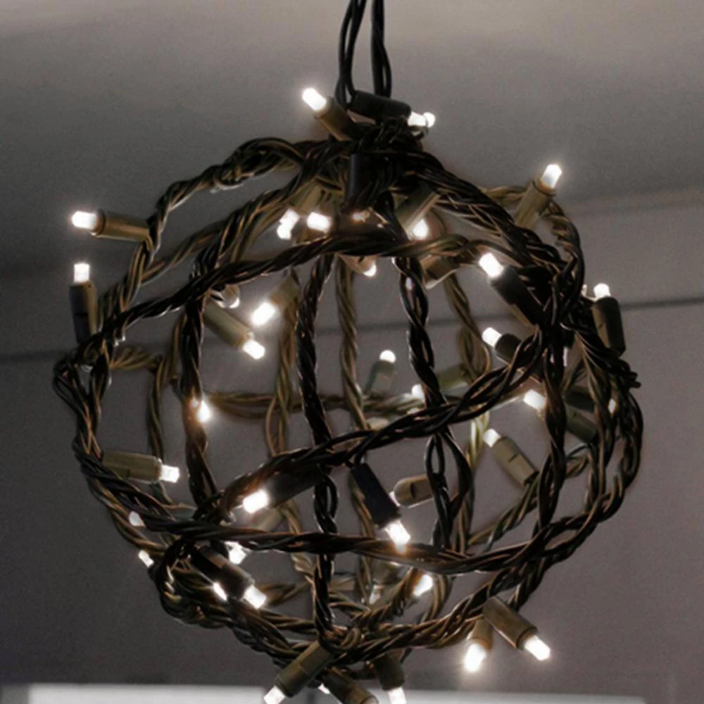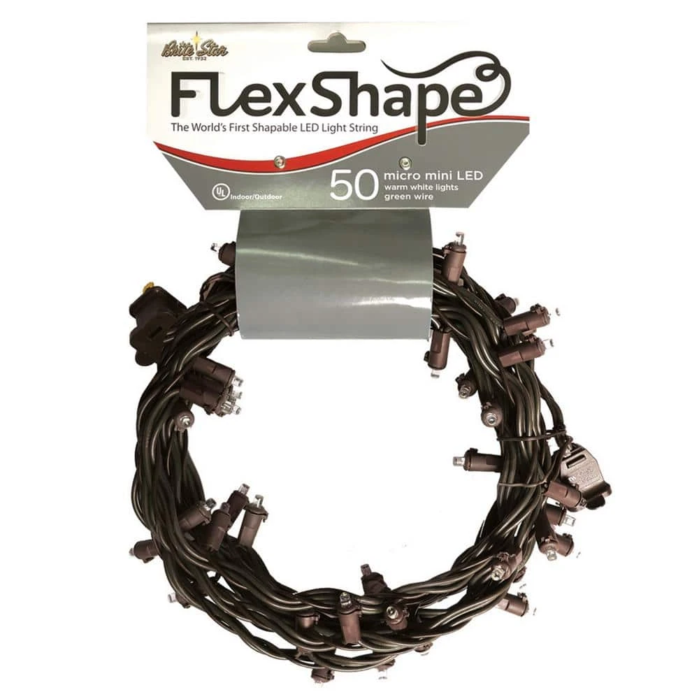 This 50-light micro mini LED flex-shape string light set, pure white, brown wire has 4 in. Lead Wire x 4 in. Spacing x 4 in. End Connect, Total Length Approximately 17 ft. It maximum connect to 43 sets, set wattage: 4.8-Watt. It is UL listed, can be used indoor/outdoor.