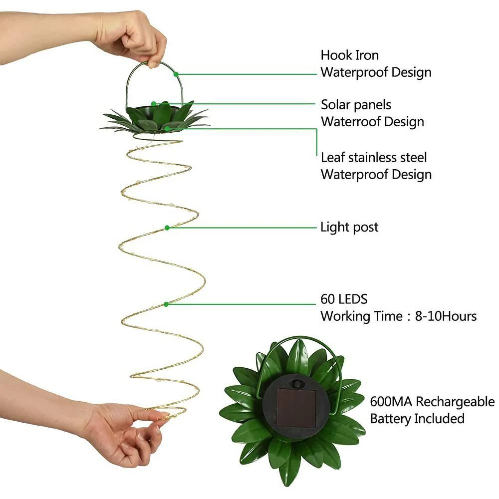 - Heavy-duty metal pineapple light post wrapped by 60 warm white LEDS plus stainless steel green leaf make an elegant look, create a soft warm white glow at night, with the portable hang can be hung on tree, vine, porch or yard