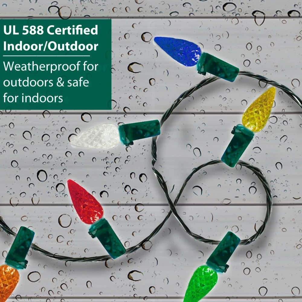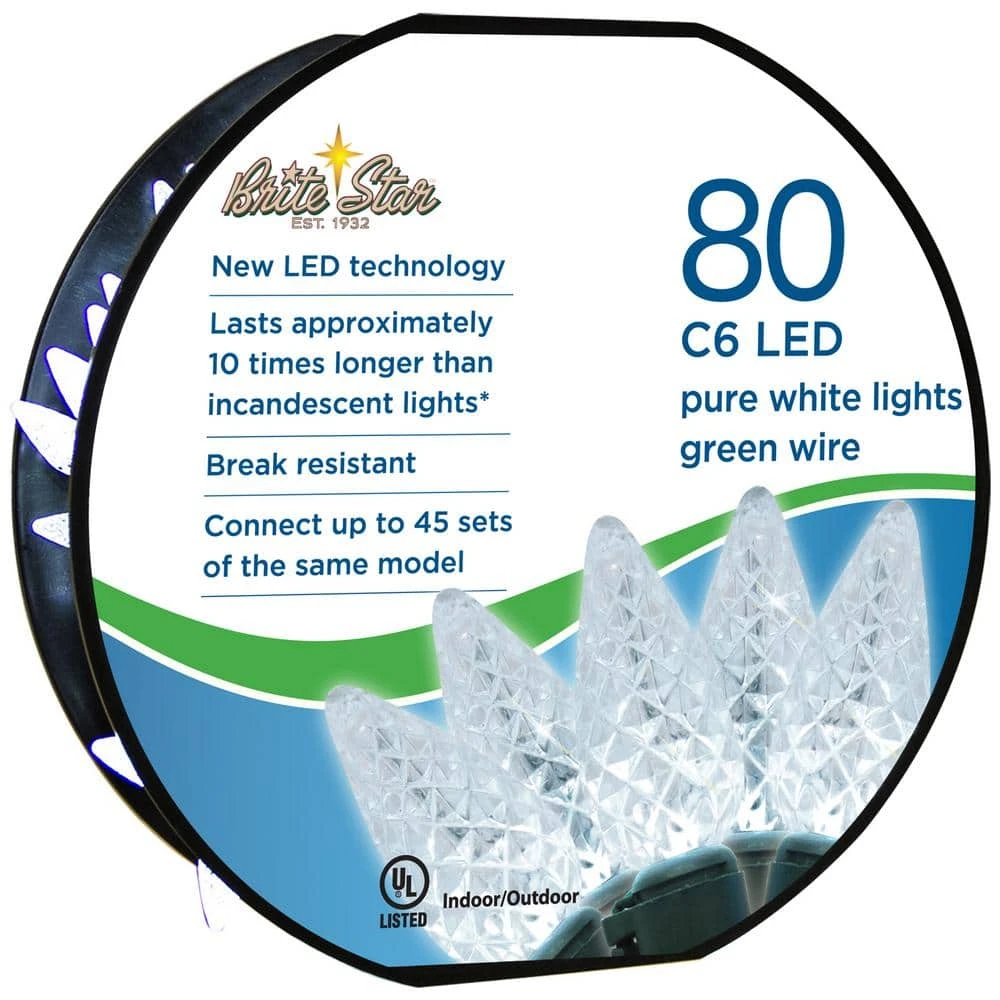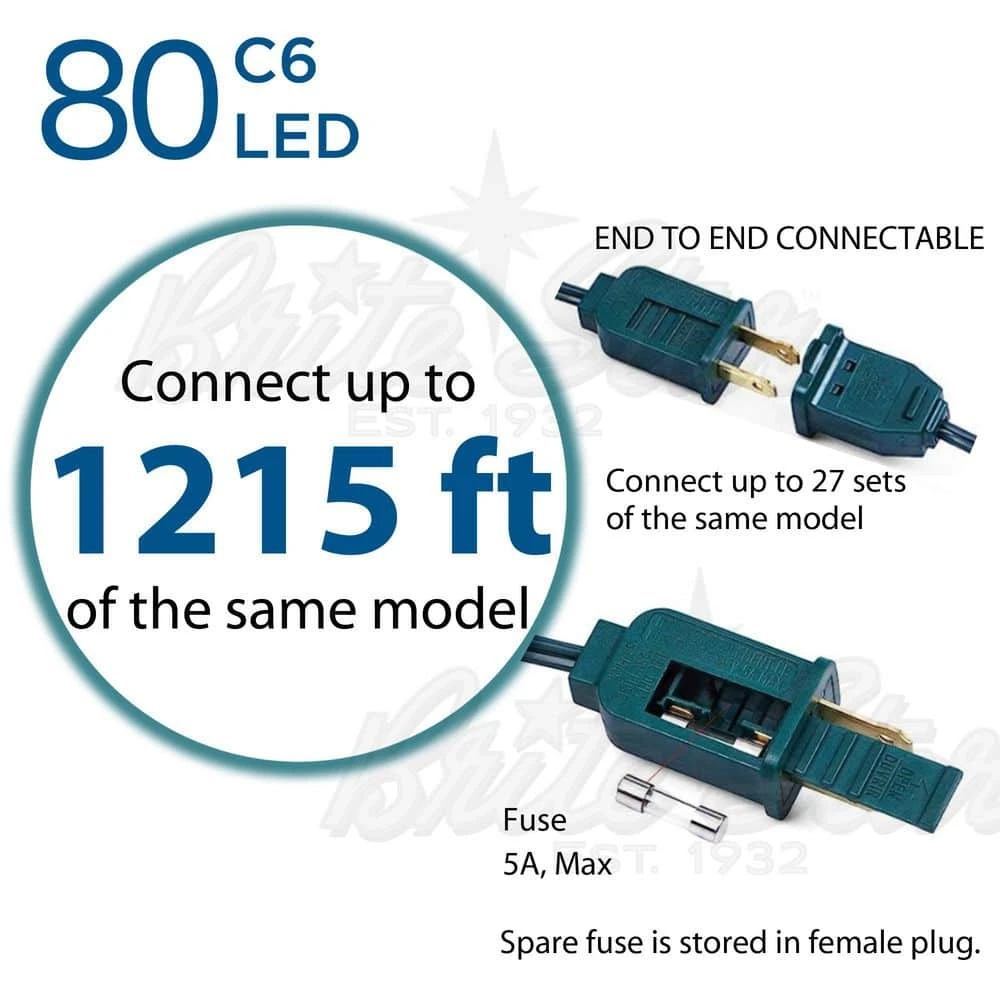 80-light C6 FACETED LED LIGHT SET ON REEL, PURE WHITE, GREEN WIRE, 4 in. x 4 in. SP x 4 in., TOTAL LENGTH APPROX 27 ft. CONNECT 21 SETS TOGETHER, SET WATTAGE: 9.6-Watt. UL LISTED, INDOOR/OUTDOOR, REPLACEMENT BULB: 2-Piece, REPLACEMENT FUSE: 1-Piece.