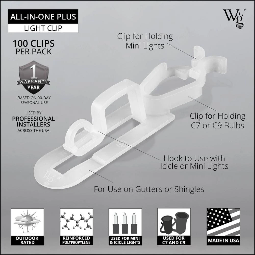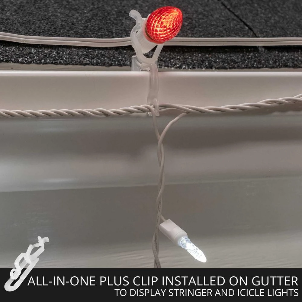 - Pack of 100 all-in-1 plus Christmas light clips for mounting C9, C7 or mini lights onto gutters or under shingles