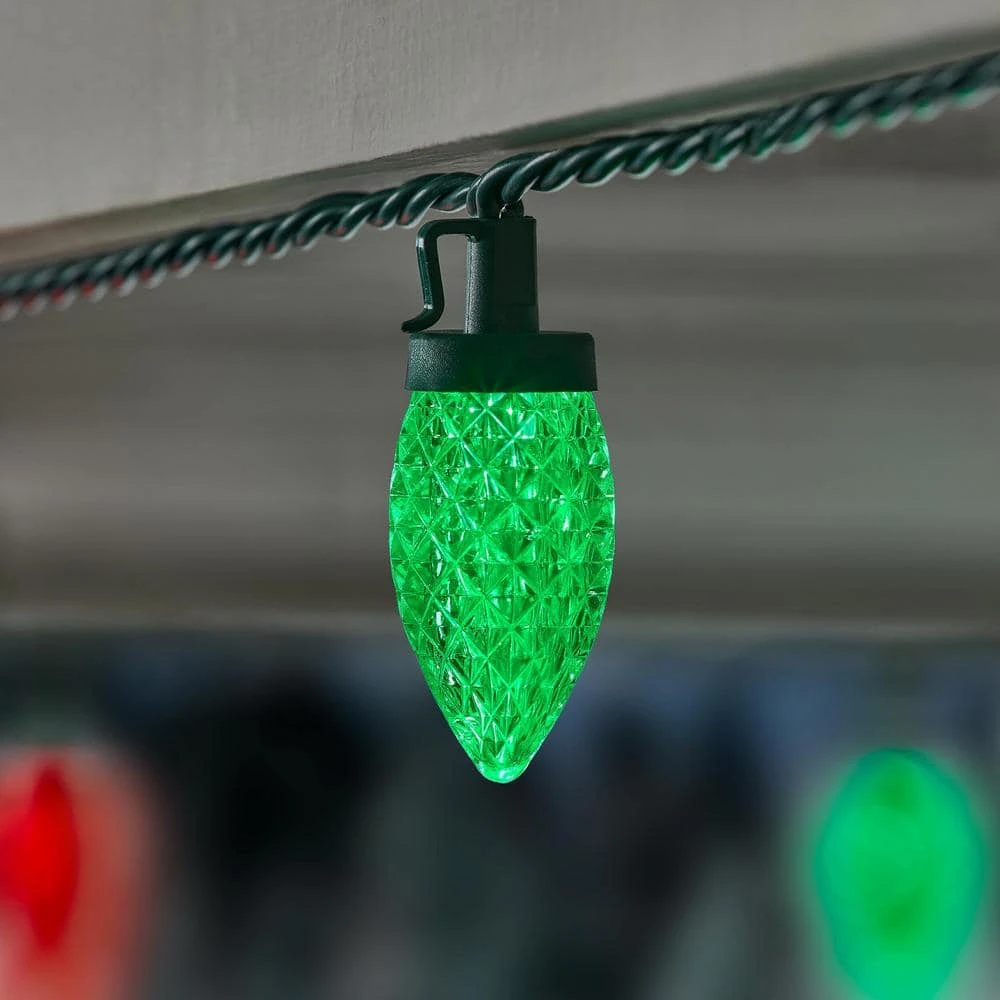 Create a dazzling display with these Home Accents Holiday 100 Count Red and Green Faceted C9 LED Lights. These LED lights are cool to touch when lit. There is 65 ft. 4 in. of lighted length to use along gutters, in trees, along fence or anywhere you want to create an outdoor light show. These lights can also be used indoors along railings or wall trimmings. They connect up to 51 sets of 50 light end-to-end on one outlet for an even more dramatic display of light. These red and green faceted lights are long lasting up to 25,000 hours (up to 15 holiday seasons). These C9 lights have a green wire and include four spare bulbs and four fuses. These lights come with a 3 year warranty, so you’ll have a merry holiday season year after year.