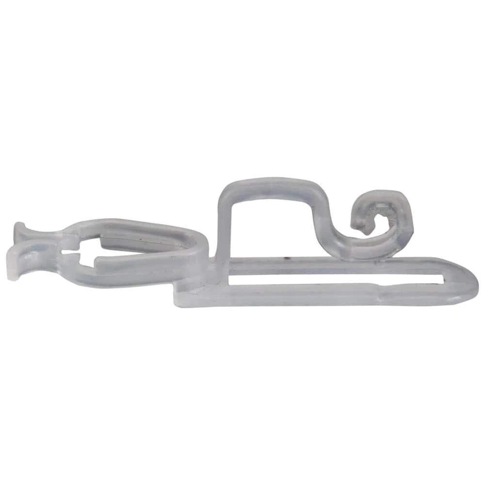 Make decorating a breeze instead of a chore while leaving time for you to enjoy all the holiday fun. Discreetly hang your holiday decor with these clear gutter and shingle clips. Light strings can attach to the clip through wire guides to securely hold lights without forcing or twisting. Features: Plastic gutter and shingle clip. Works with most C7 C9 mini icicle curtain and LED light sets. Can also be used for garland or other decorations. Snaps on gutters or slides under shingles. Recommended for indoor or outdoor use. Made of weatherproof and reusable material. Not intended for permanent installation; For seasonal use only. Hooks are designed to fit all standard gutters and shingles and work on most roofs. Dimensions: 3.25 in. H x 0.75 in. W x .80 in. D. Material(s): plastic. Note: Set includes 100 clips.