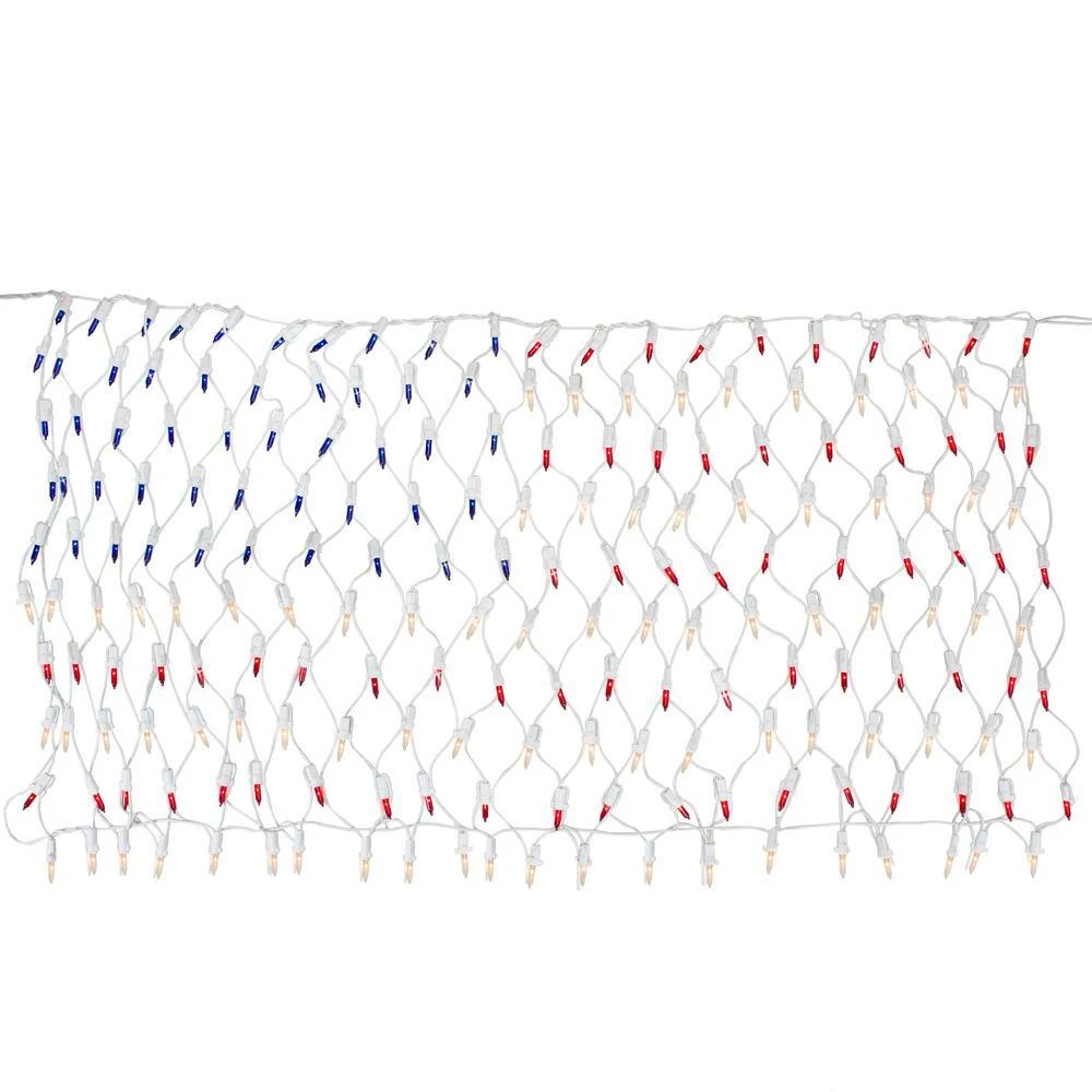 What better way to show your patriotism. Great for decorating bushes trees or windows. Product Features: Color: red blue and clear bulbs/white wire. Number of bulbs: 200. Bulb size: mini. Dimensions: 24 in. x 33 in., 24 in. lead cord. 4 in. tail cord. Additional Product Features: If 1-bulb burns out the rest will stay lit. Contains end-to-end connectors which allows you to connect multiple sets together (not to exceed 210-Watt). Comes with replacement bulbs and spare fuse. UL certified and approved for indoor or outdoor use. Wire gauge: 22. 120-Volt 60 Hz 2.4 Amp 50-Watt. Dimensions: 24 in. H x 33 in. W. Material(s): glass bulbs/wire.