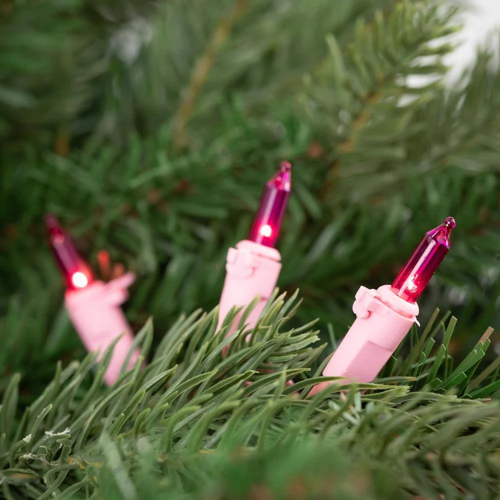 Get ready to dazzle this holiday season with this set of pink mini Christmas lights. With its vibrant pink hue and a long pink wire these lights are perfect for adding a touch of whimsy and charm to your decorations. Whether you’re decorating your tree wreaths or creating a festive atmosphere indoors or outdoors these mini lights will create a stunning visual display. Spread the holiday cheer with our pink light set and make your celebrations shine with a delightful pink glow. Product Features: Color: pink bulbs/pink wire. Number of bulbs on string: 50. Bulb size: mini. Bulb type: incandescent. Spacing between each bulb: 2.5 in. Lighted length: 10 ft. Total length: 11.25 ft. 12 in. lead cord. 3 in. tail cord. Additional Product Features: Lights are equipped with Lamp Lock feature which makes them replaceable interchangeable and keeps them from falling out. If one bulb burns out the rest will stay lit. Contains end-to-end connectors which allows you to connect multiple sets together (not to exceed 210-Watt). Comes with replacement bulbs and spare fuses. UL certified and approved for indoor/outdoor use. Wire gauge: 22. Wattage: 20.4. Material(s): glass bulbs/wire.