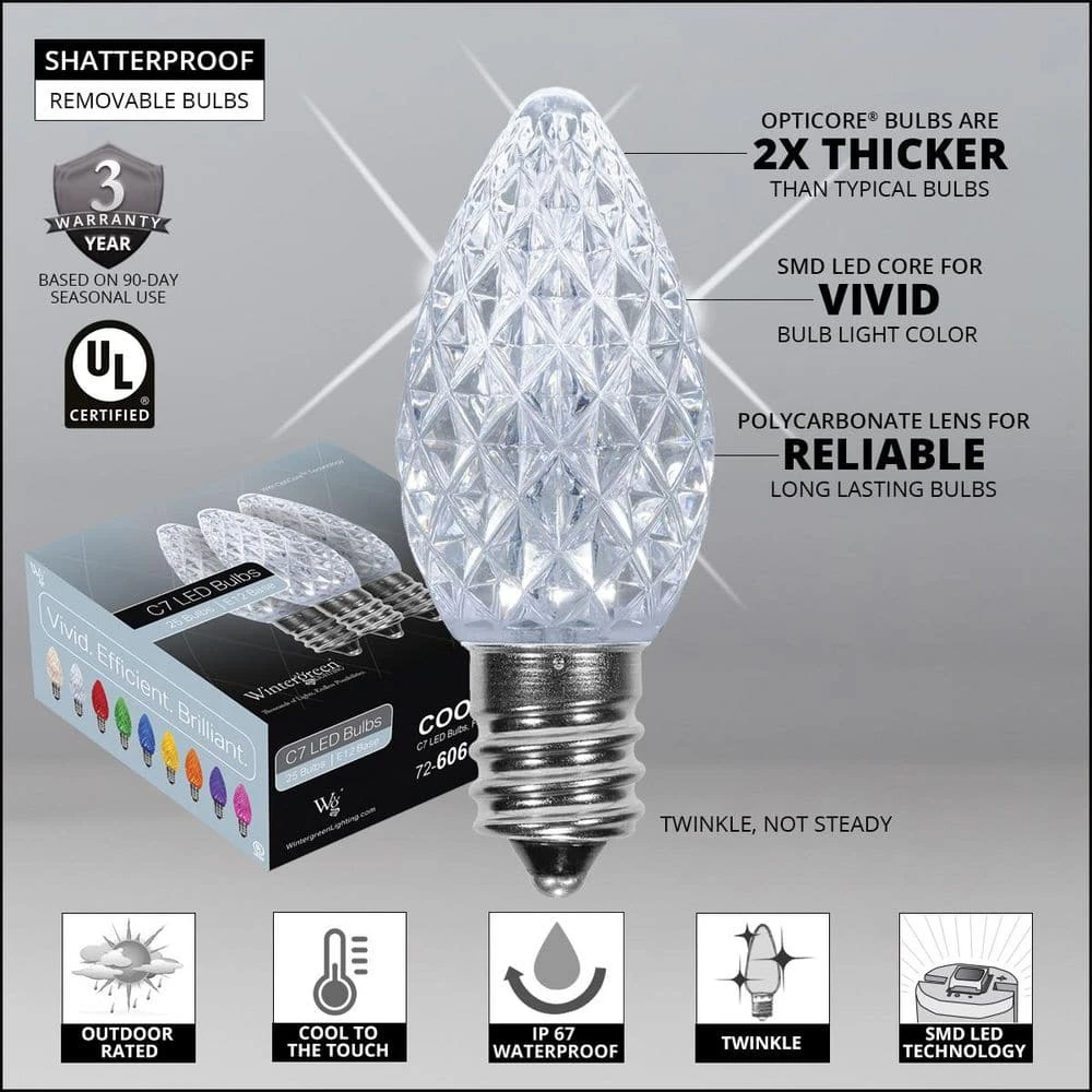 - 25 OptiCore C7 cool white LED twinkle bulbs and one 25 ft. green E12 stringer with sockets spaced 12 in. apart, 6 in. leads with fused polarized male plugs, 6 in. tails with female plugs for end to end connections, 25 ft. total light kit length, to assemble, simply twist bulbs into sockets