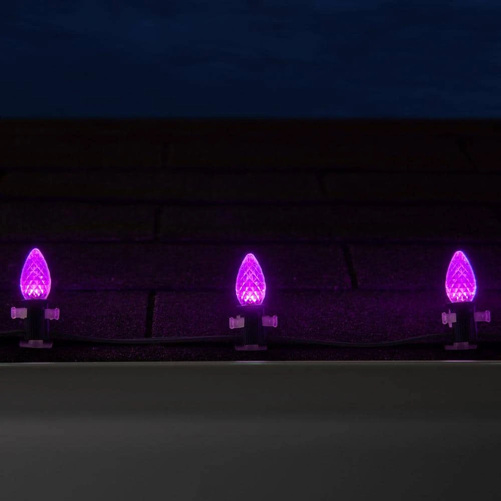- 25 OptiCore C7 purple LED bulbs and one 25 ft. green E12 stringer with sockets spaced 12 in. apart, 6 in. leads with fused polarized male plugs, 6 in. tails with female plugs for end to end connections, 25 ft. total light kit length, to assemble, simply twist bulbs into sockets