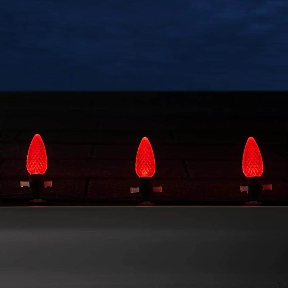 - 25 OptiCore C9 red LED bulbs and one 25 ft. green E17 stringer with sockets spaced 12 in. apart, 6 in. leads with fused polarized male plugs, 6 in. tails with female plugs for end to end connections, 25 ft. total light kit length, to assemble, simply twist bulbs into sockets