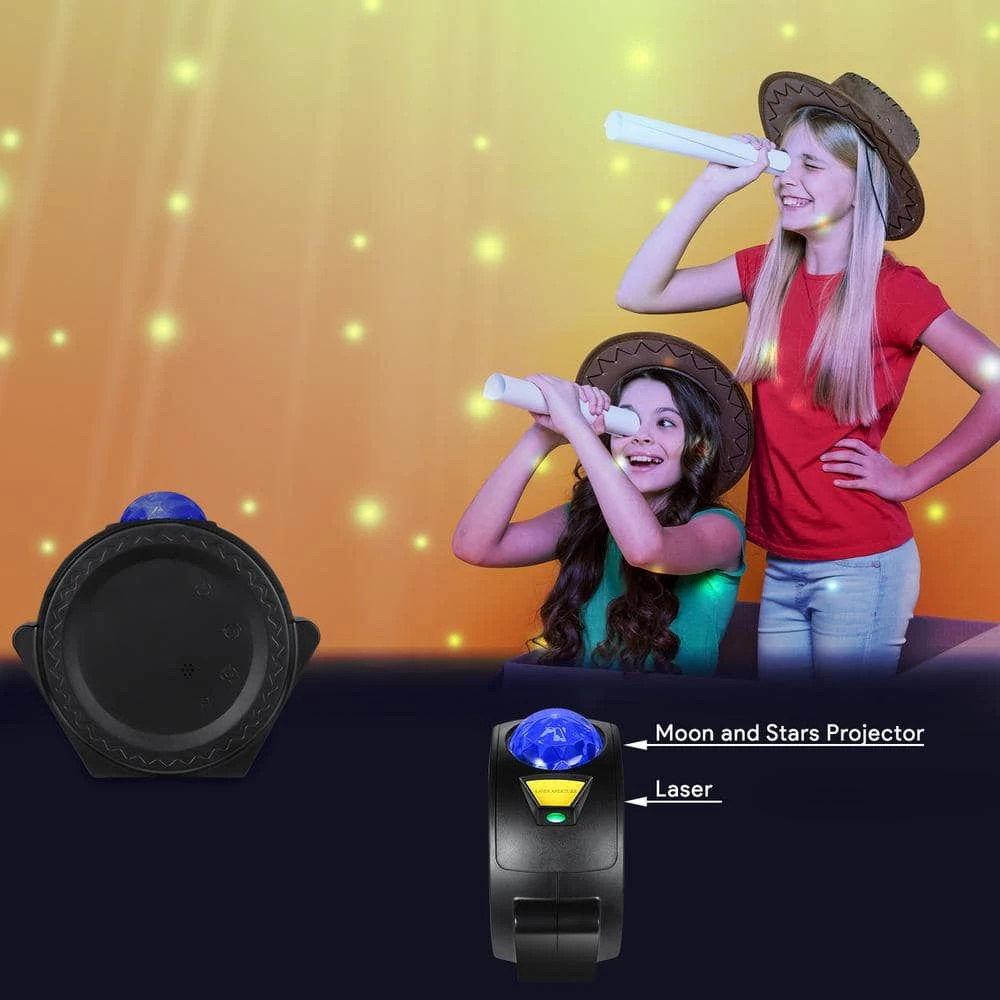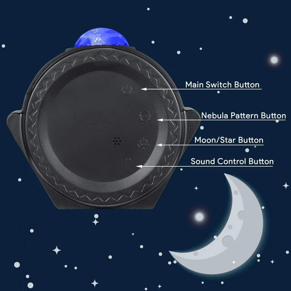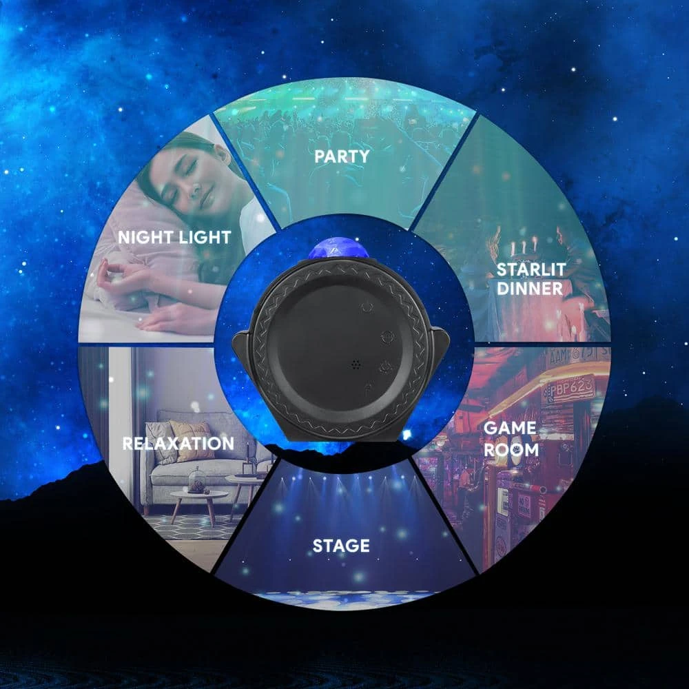 The DARTWOOD Starry Sky Laser Projector includes a sound control mode and multi-projection effects. It is an ultra quiet projector that creates a relaxing environment. Consists of star projector and nebula projector with 6 colors. It can be used as a night light and for parties, starlit dinner, game room, stage and relaxation. It consists of the moon and stars projector along with a laser. Roam in the universe with the star projector. You can have a unique perspective either via roof projection or the wall projection. It consists of the main switch summary, nebula pattern summary, moon/star summary and a sound control summary.