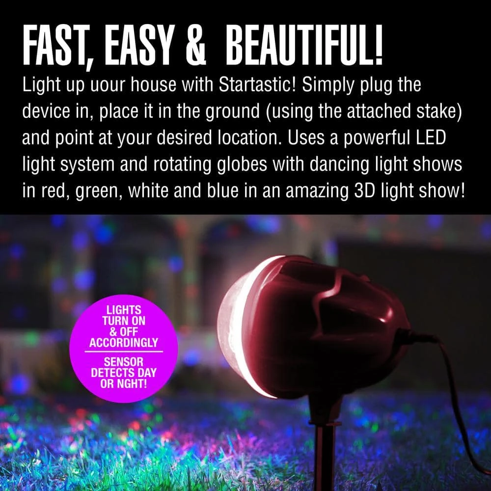 - Because Startastic Max uses environment-friendly LED bulbs, it utilizes 99% less energy than your standard decorative lighting; Rain and snow/frost-resistant