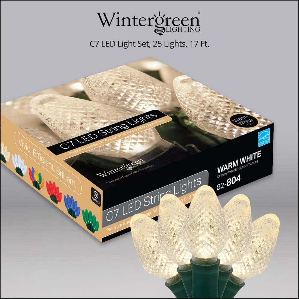 The SuperBright C7 string light sets from Wintergreen Lighting are the perfect solution when you want durable, easy-to-install and economical C7 Christmas lights. They feature 25 lights to a set, spaced 8 in. apart, with bulbs permanently installed. All you have to do is take them out and string them up. Because they are so energy efficient, you can connect dozens of these light sets together end to end. And the bulbs are rated to an average life span up to 100,000-hours. The acrylic bulbs are shatter resistant, and the patented 1-piece construction seals out moisture to prevent corrosion. C7 bulbs are smaller than C9s, perfect for a wide variety of holiday lighting and decorating uses, inside and outside. Use them to light smaller outdoor trees for Christmas, or to outline rooflines, fence lines and other structures. Or use them indoors to light mid- to larger-size Christmas trees, or along mantels, railings and more. Fun, versatile, bright and colorful, these energy efficient, shatter resistant C7 string lights are ready to go, anytime.
