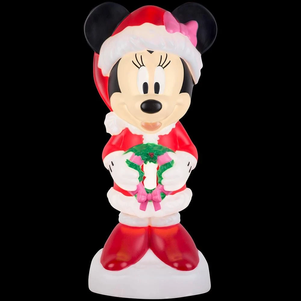 This adorable Minnie Mouse blow mold figure makes a delightful addition to your holiday decorations. Featuring Minnie Mouse decked out for the season in a Santa outfit, she’s ready for the season with a wreath and pink accents. This lighted outdoor decoration is weather-resistant for indoor or outdoor use. Perfect for fans of Disney, our Minnie Mouse blow mold pairs perfectly with the Mickey Mouse blow mold.